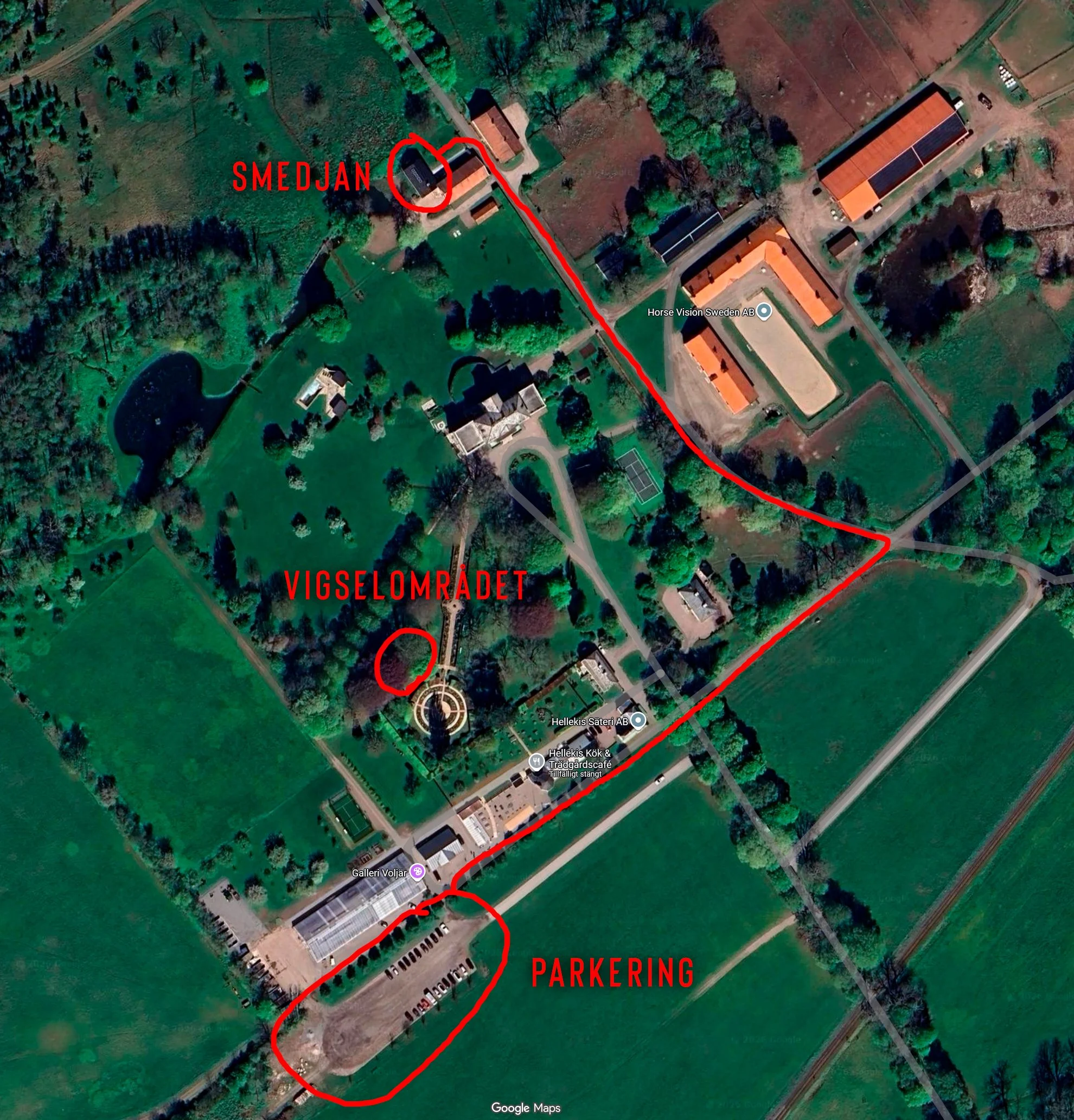 För dom som kör egen bil så får ni parkera vid Säteriets restaurang. Om ni får skjuts så sker även avlämning där då det blir för mycket trafik på den väldigt lilla vägen ner till Smedjan annars. Säteriet ägs av privatpersoner som bor i den stora byggnaden i mitten. Vi går inte genom deras tomt utan tar istället vägen som är markerad på bilden.